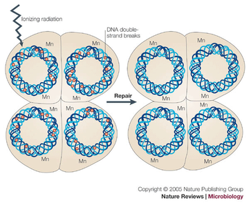 DEINOCOCCUS RADIODURANS: This bacterium shows remarkable resistance to a range of damage caused by ionizing radiation, desiccation, UV radiation, oxidizing agents, and electrophilic mutagens. It can continuously grow in the presence of chronic radiation and has an efficient DNA repair process.